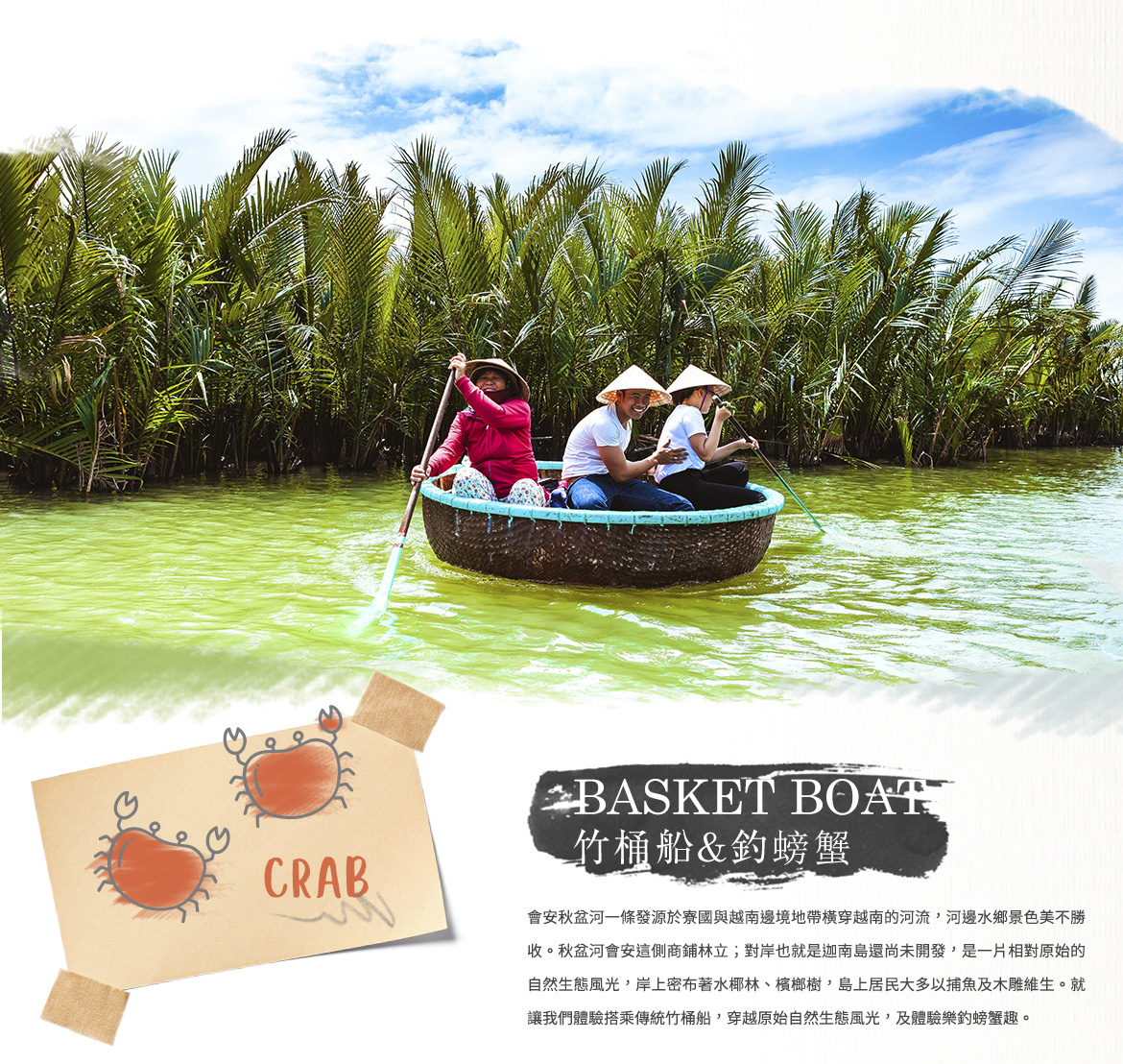 【迦南島-體驗竹桶之旅+樂釣螃蟹趣專車前往會安碼頭搭乘船隻前往對岸迦南島,迦南島位於會安對岸,於會安碼頭搭乘船隻約30分鐘之船程,會安秋盆河一條發源於寮國與越南邊境地帶橫穿越南的河流,河邊水鄉景色美不勝收。秋盆河會安這側商鋪林立;對岸也就是迦南島還尚未開發,是一片相對原始的自然生態風光,岸上密布著水椰林、檳榔樹,島上居民大多以捕魚及木雕維生。就讓我們體驗搭乘傳統竹桶船,穿越原始自然生態風光,及體驗樂釣螃蟹趣。午餐享用花蟹火鍋螃蟹,餐後前往附有中國文化色彩濃厚的古埠。