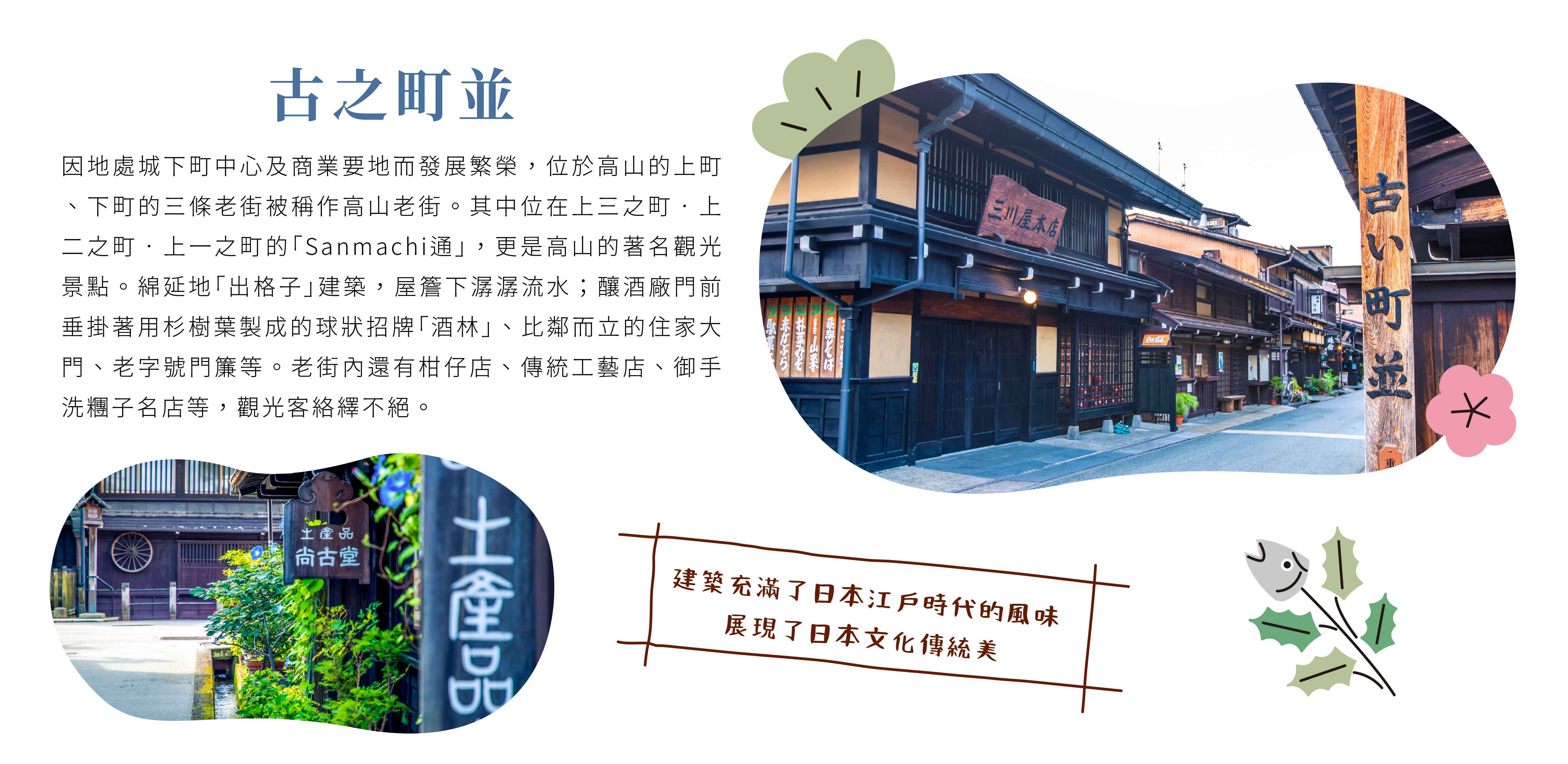 ●【上三之町,古之町並】從陣屋步行三分鐘即可抵達有「飛驒高山小京都」之美稱的【上三之町】,由數條街道組成「古之町並」,為高山代表散策名所,亦為國家選定重要傳統的建造物群保存區。這裡有古老的商店街、橋樑、傳統酒店等。在自然與歷史的保護下,每間店舖的外觀建築和內在陳設都保存著江戶時代以來的濃厚古早原味。屋齡大都在百年以上,是稀有珍貴的古建築物群。進入此街道中彷彿回到三百年前日本的時代中,並有當地之民俗產品,您可漫步在古街道上帶著懷古之情尋找飛驒之匠的手藝。
