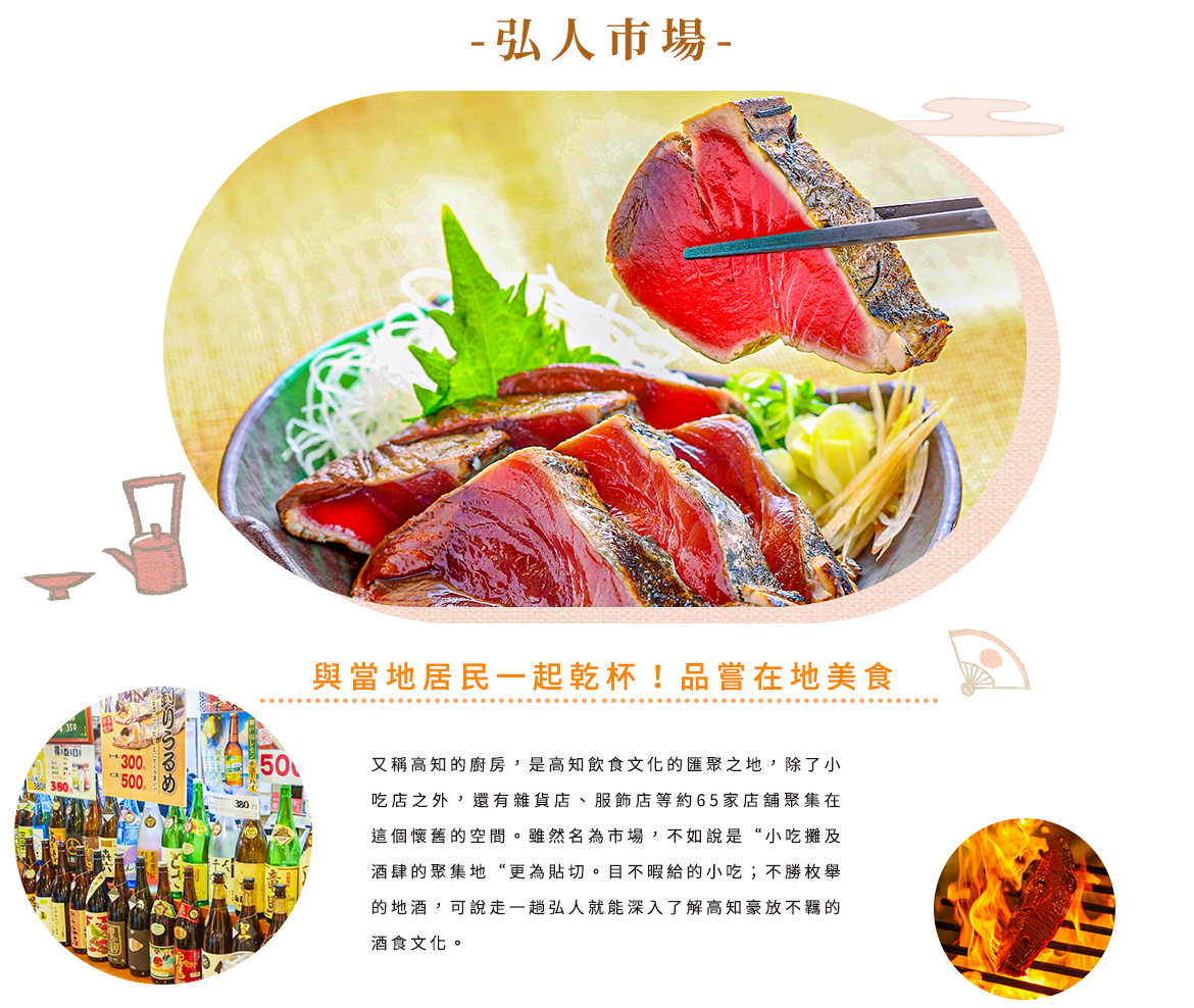 弘人市場(西洛梅市場)】1998年10月17開業至今吸引了許多觀光客跟在地人,市場分為城市廣場、龍馬大道、時尚橫丁、城下廣場、乙女小路等個區域,裡頭匯集了有鮮魚店肉店、雜貨店、洋貨舖、餐飲店、等店鋪,這裡有高知的鄉土料理與各地特色物產應有盡有,讓人可以在短時間內完成吃在地特色美食跟買特色紀念品的好地方。