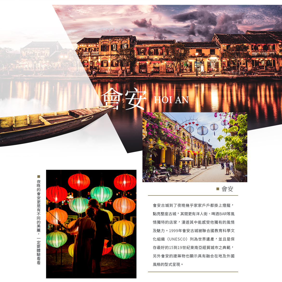 【會安古城】1999年聯合國教科文組織將會安古城定為世界文化遺產會安古城(Hoi An)是中國人在南越定居的第一個城市,漫步古城老街,映入眼簾的都是熟悉的漢字。明末清初之時,有五位明朝大將軍不願投降清朝,攜家帶眷渡海在這兒安身立命。鄭和下西洋到越南時,就是停留在會安,從此帶來了華人移民。要感受會安古城濃厚的中國氣息,要到Lei Loi及Tran Phu兩大老街,兩旁盡是已屹立了數百年的古老中式建築,建築由山牆、彩色鴛鴦瓦蓋頂、硬木做成的柱椽、門扇、紅牆綠瓦組成深宅大院,無論是屋子的結構、佈置及傢俱,都極富中國氣息。後來法國人新蓋的法式古典庭園式建築夾雜在古城之間,依著秋盤河而建,悠閒又浪漫。法式建築外形漂亮、線條優美,外牆裝飾歐洲文藝復興時期的雕塑,頗具藝術性。