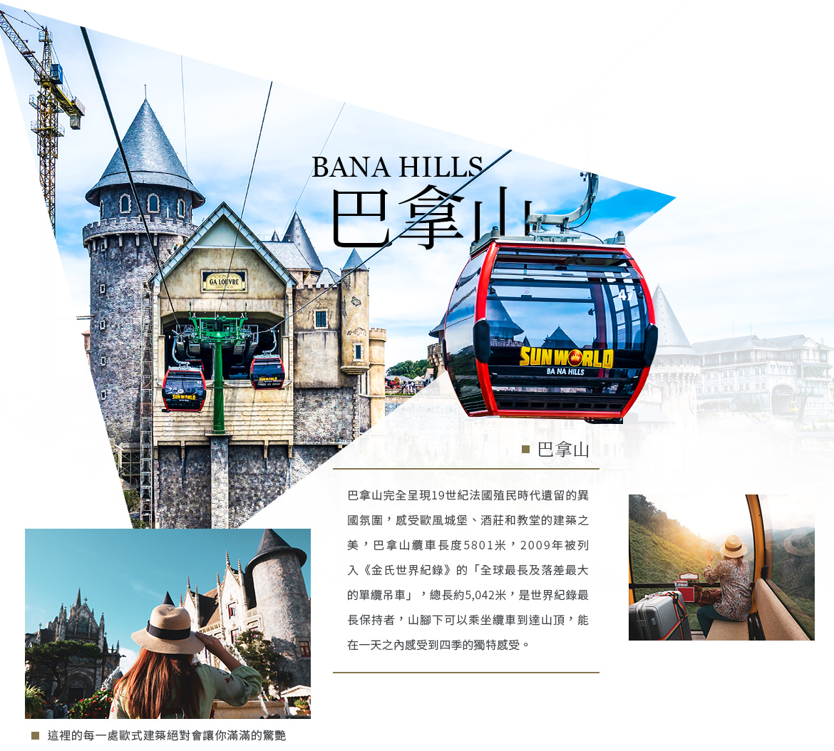【婆納法國山城-巴拿山】搭乘纜車,於2009年被列為健力士記錄的全球最長及最高不停站纜車,纜車分為兩段;第一段需搭乘約35分鐘(最長及最高不停站纜車)、接著轉程第二段需搭乘約5分鐘,一覽精彩的峴港美景纜車長16545呎,20分鐘直達海拔4239呎的山上。纜車剛開始攀升,腳下盡是樹林石澗,10分鐘後以身處於雲海當中,眼前景像猶如身處仙境之中。法國人曾在此建立避暑區,氣候一日四季:早晨春季、中午夏季、下午秋季、夜晚冬季。婆納有遼闊的自然林,溪泉縱橫其間,天氣晴朗時,站在主山頂,可以看見峴港市、容橘灣、美溪海等整個寬廣空間,猶如一幅巨型山水畫。今天,婆納-主山區已成為著名旅遊區。旅館、別墅以及其他服務如餐廳、網球場等等配套齊全。遊客上山坐吊纜車抵達山頂,婆納之美在於仰天看不到太陽,晚上看不到星星,續參觀建於頂峰雄偉靈應寺,體會靈性之旅,山頂享受渡假休閒之美。接著前往夢想樂園遊玩。夢想樂園是世界三大室內娛樂公園。