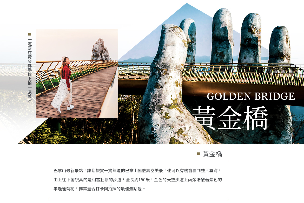 【天空步道-黃金橋】越南的新景點!這座名為「黃金橋」(Golden Bridge)的橋梁建於巴拿山(Ba Na Hills)上,於2018年6月開放,便在網路上引起熱烈的討論,「巨手托橋」的設計,令人驚嘆,黃金橋總長約150公尺,黃金橋上兩隻巨大而布滿青苔的手,溫柔地捧著金色的橋身,聳立於雲霧之上,藏身在山嵐中卻不突兀,就像已存在於此幾世紀般自然,走在橋上眺望遠山綠林,一望無際,心曠神怡。