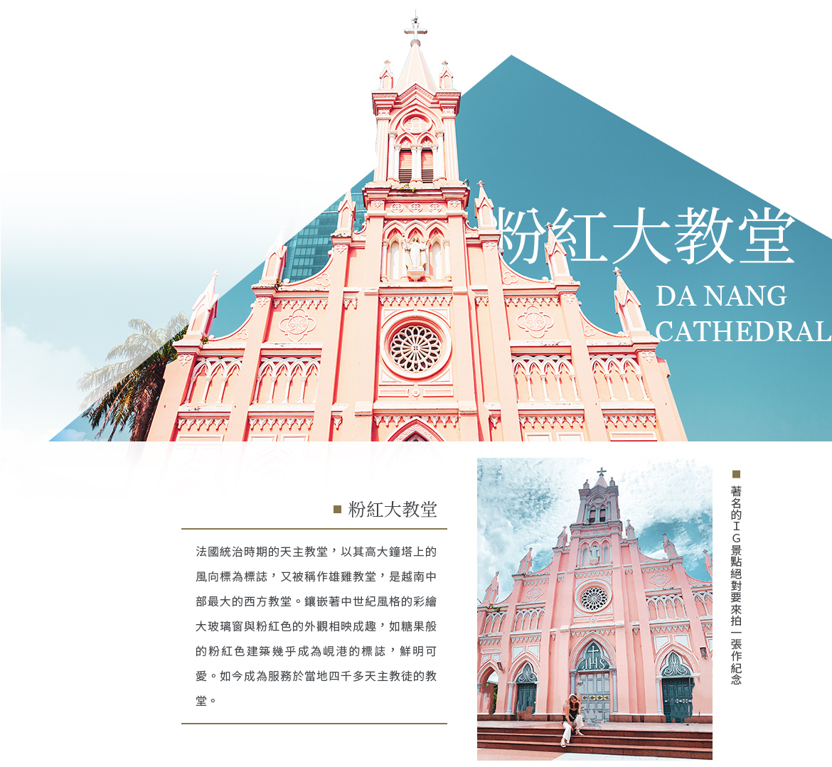 【粉紅教堂】峴港市最有歐洲特色的要數這個建於1923年法國統治時期的天主教堂。它以高大鐘樓上的風向標誌為記認,又被稱作雄雞教堂,係越南中部最大的西方教堂。如今成為服務於本地四千多天主教徒的教堂,如糖果般的粉紅色建築幾乎成為峴港的標誌,鑲嵌著中世紀風格的彩色玻璃。