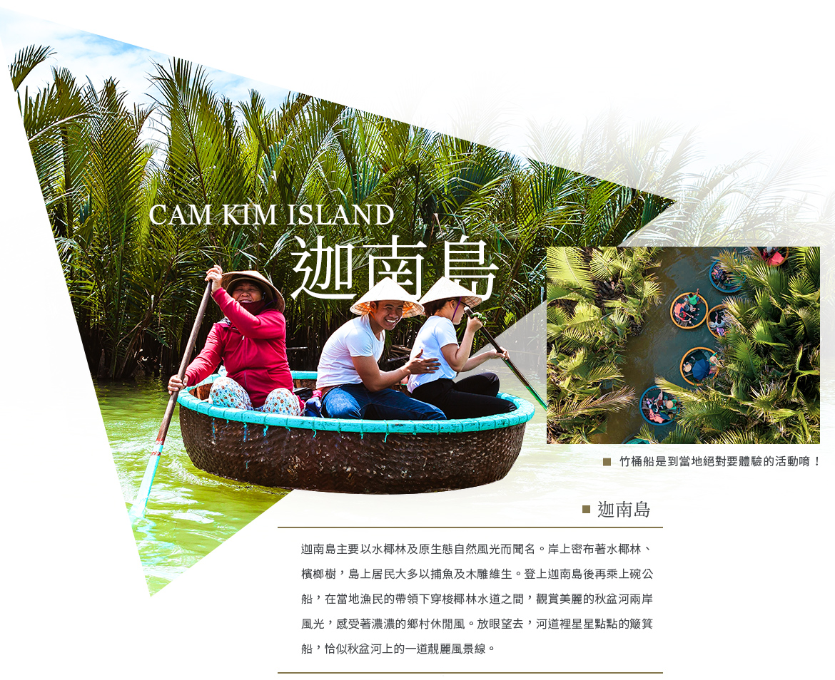 【迦南島-體驗竹桶船之旅+樂釣螃蟹趣】專車前往會安碼頭搭乘船隻前往對岸迦南島,迦南島位於會安對岸,於會安碼頭搭乘船隻約30分鐘之船程,會安秋盆河一條發源於寮國與越南邊境地帶橫穿越南的河流,河邊水鄉景色美不勝收。秋盆河會安這側商鋪林立;對岸也就是迦南島還尚未開發,是一片相對原始的自然生態風光,岸上密布著水椰林、檳榔樹,島上居民大多以捕魚及木雕維生。就讓我們體驗搭乘傳統竹桶船,穿越原始自然生態風光,及體驗樂釣螃蟹趣。午餐享用花蟹火鍋螃蟹,餐後前往附有中國文化色彩濃厚的古埠。
