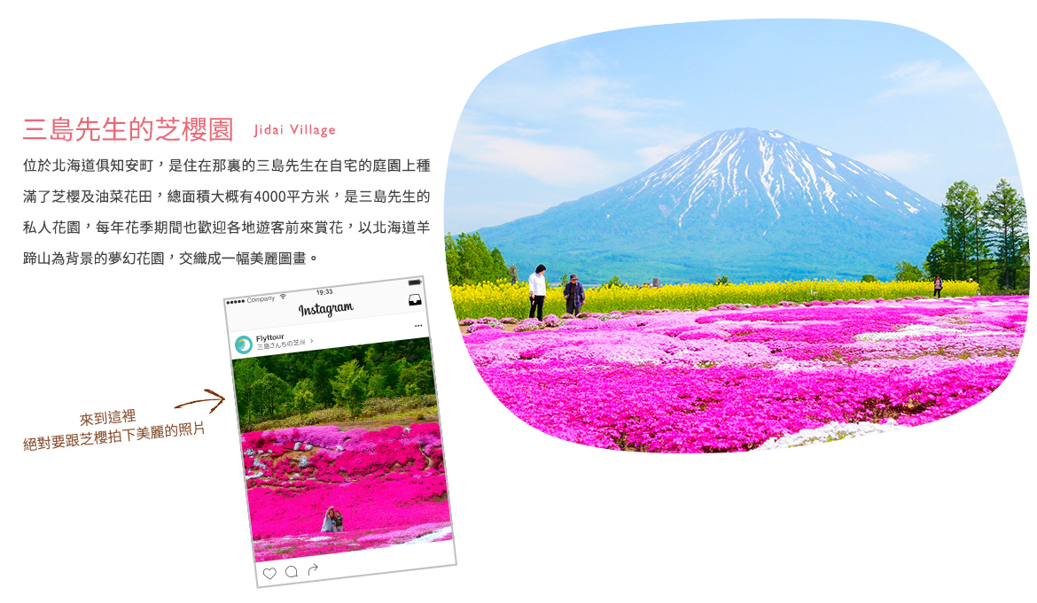 位於北海道倶知安町,是住在那裏的三島先生在自宅的庭園上種滿了芝櫻及油菜花田,總面積大概有4000平方米,是三島先生的私人花園,每年花季期間也歡迎各地遊客前來賞花,以北海道羊蹄山為背景的夢幻花園,交織成一幅美麗圖畫。