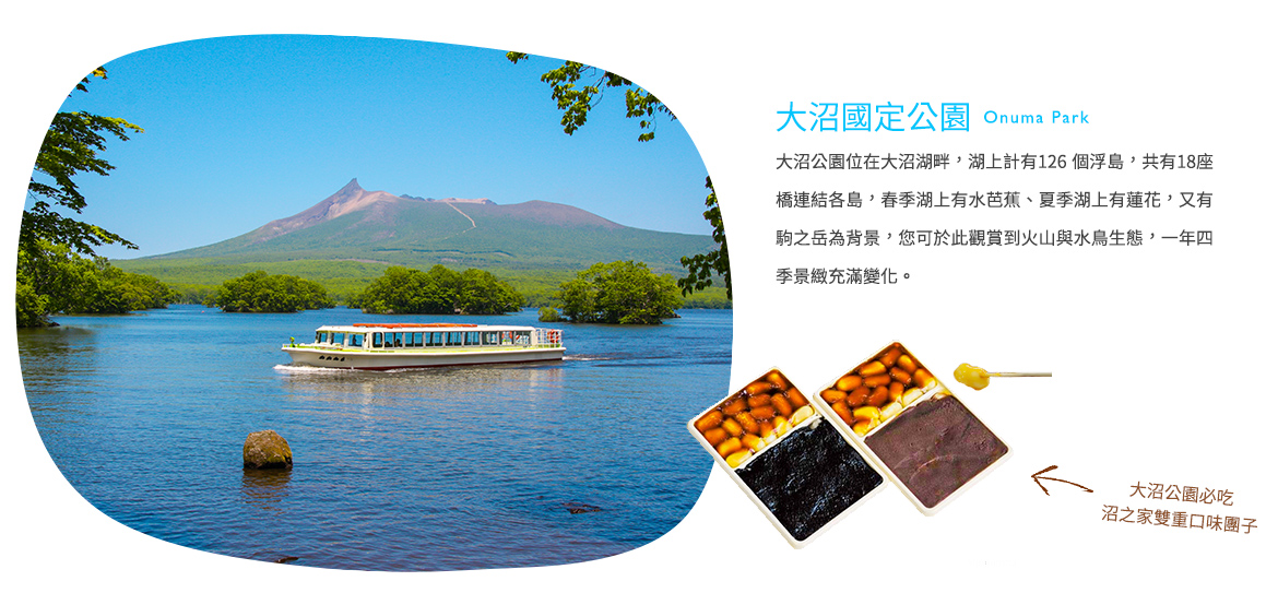 位於函館郊外,1958年被指定為國定公園,是日本新三景之一。大沼國定公園以大沼湖和附近的小沼、蓴菜沼以及海拔1133米的駒岳的美麗山峰為主。而大沼是大沼國定公園中面積最大的湖,周長24公里,湖上共有大小126個島嶼星羅棋布,妝點得宛如一盆盆精緻美麗的盆景,島嶼與島嶼之間有18座橋樑連接的景象十分秀美,堪稱一大奇觀。