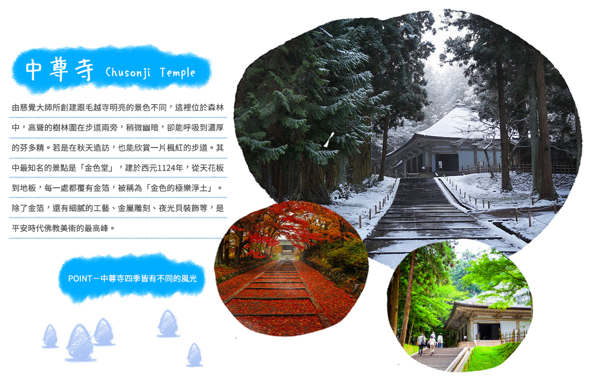 20116月被登錄為世界文化遺產的中尊寺,昔稱『北方京都』的平泉,市內典雅的東北第一大名寺,開創於西元850年,在1105年由藤原第一代的清衡親手重建;當時的平泉有21所堂宇和300所以上的佛教設施,是可與京相匹敵的文化都市,在最盛時期約有40個燈塔,佔地遼闊,並可瞭望平泉風景。保有戰國時代東北藤原家族 100年的象徵,從金色堂到月見坡的蒼鬱杉林,不經意流露曾經風華的歲月,螺鈿工藝、描金畫等創作更顯金色堂的氣派華麗,而中尊寺的楓葉更是東北熱門觀光點之一。(不入金色堂)