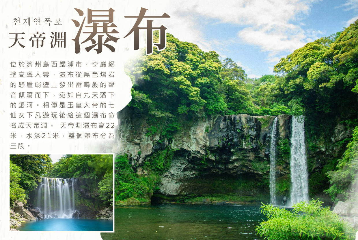 因七仙女夜裡順著雲橋下凡來此遊玩,而得名天帝淵(上帝的池塘)。三段式瀑布從茂密林間墜落,場面蔚為壯觀。瀑布水從第一瀑布飛落後形成池沼,接著從第二瀑布、第三瀑布落下後匯入大海。另外還能欣賞刻有七仙女像的仙臨橋。