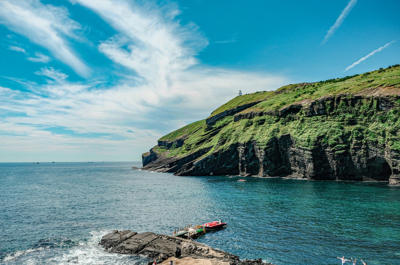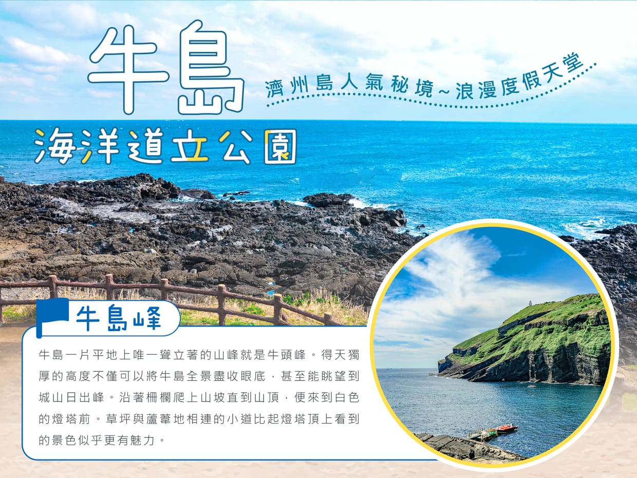 牛島位于濟州島東端,是一個島中島,因其形似一頭臥牛伸著頭,故得名牛島;有珊瑚之島、海女之島、燈塔之島等別名的牛島是多部韓劇【人魚公主】、【連理枝】、【觸不到的戀人】取景之地。北濟州郡為了保護牛島的自然景觀和清凈海區,并搞活海洋觀光,將島內的兩處港口的周圍及牛島附近的海域指定為牛島海洋郡立公園。