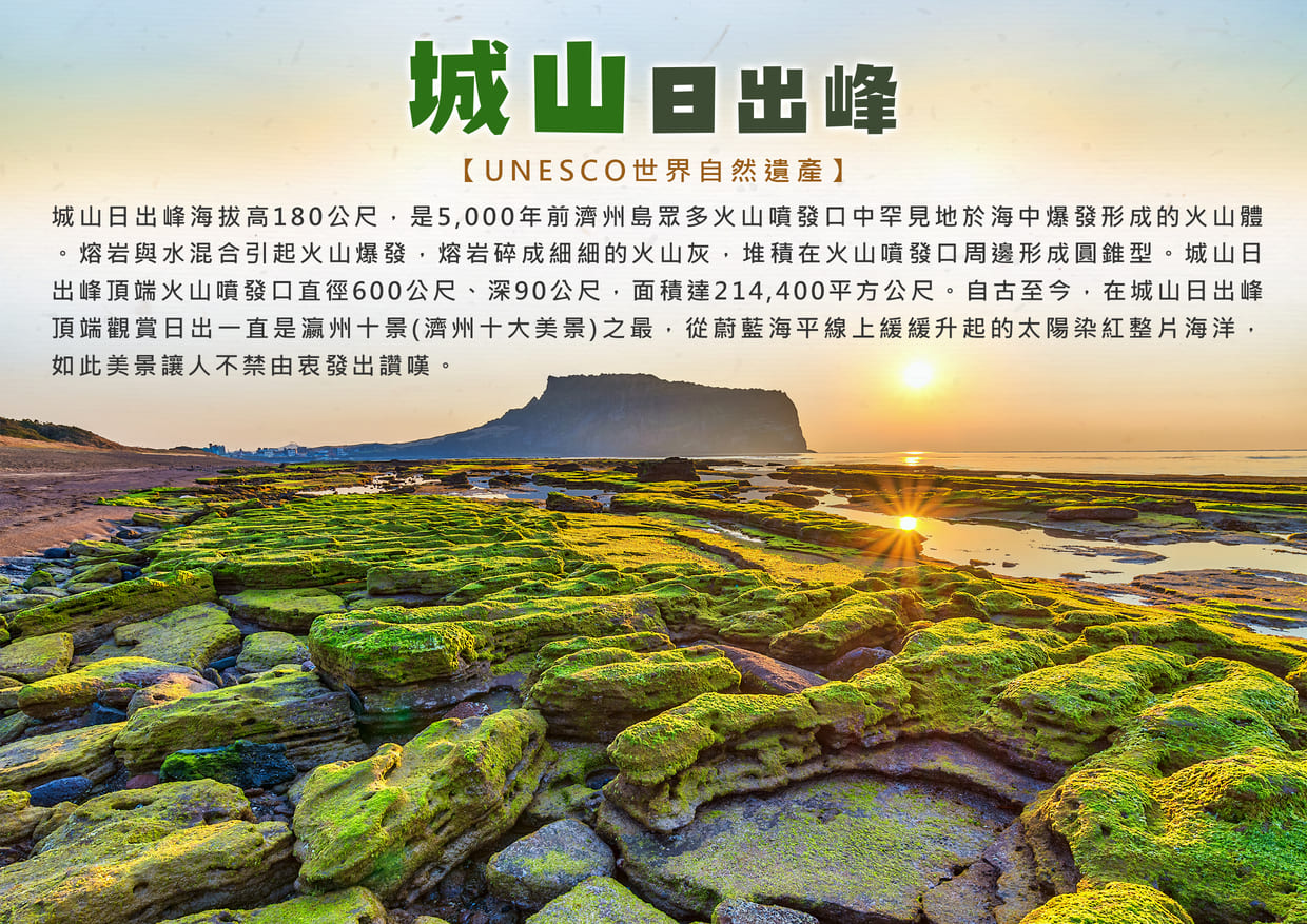 為漢拏山360個止火焰山之一,也是世界最大的突出於海岸的火山口,攀登30分鐘左右到達山頂;由此也可觀看日落,加上可以瞭望一片廣闊的牧場,美不勝收,令人嘆為觀止,遠眺這山峰綺麗景色。這裡每天都有固定時間的海女表演,海女是自古以來濟州女性獨立謀生的特異技能,海女以不攜帶任何潛水用具潛入海中,並徒手捕獲新鮮的海產,因此被稱為海女。