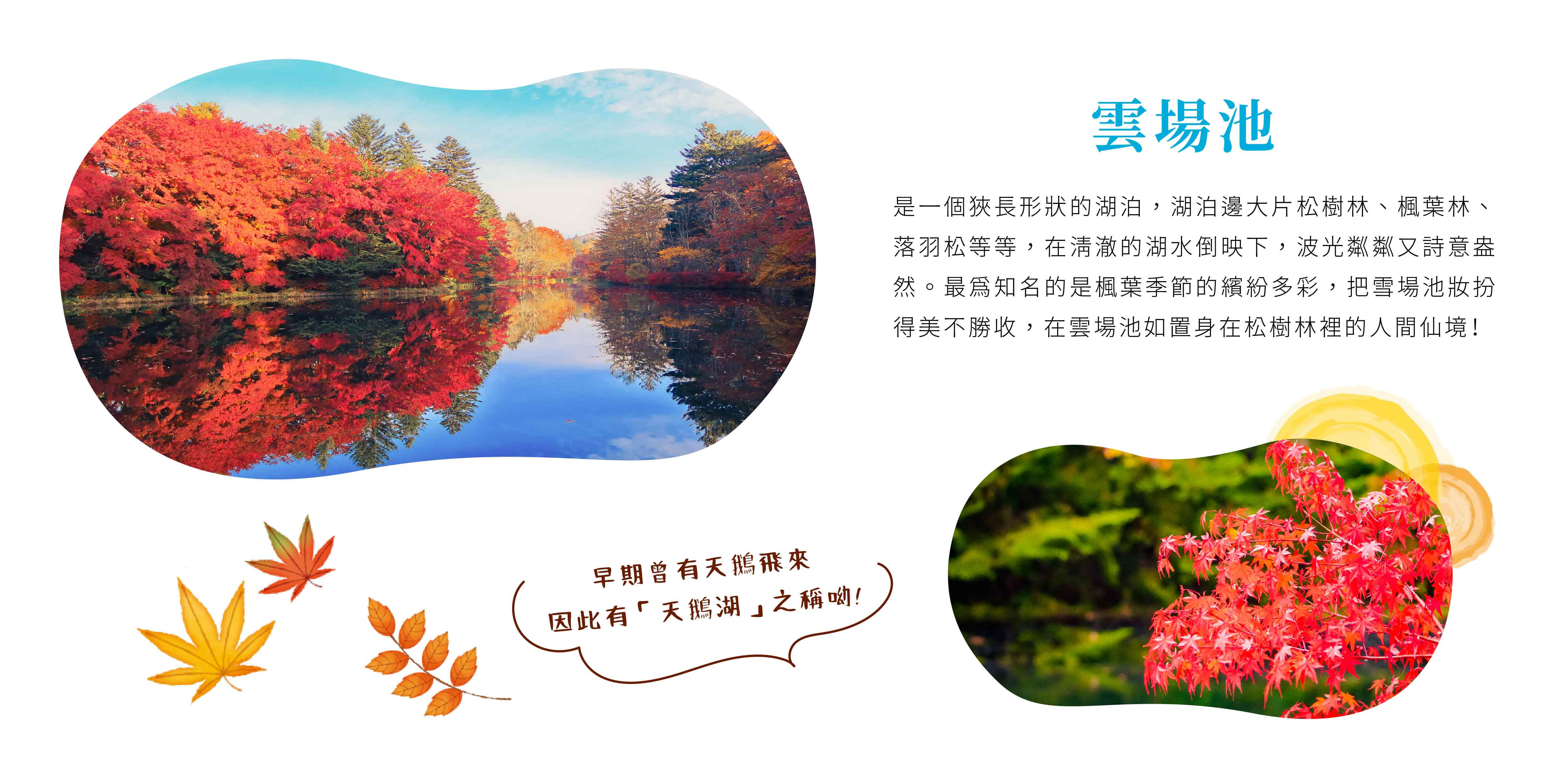 佔地達 2000 坪的【雲場池】又名天鵝池,池塘水清澈見底,傳說細長的池塘是巨人留下的腳印而成。秋天時的雲場池倒映的紅葉讓池水,彷彿也染上一片艷紅;而夏天時池旁兩邊樹叢翠綠,也別有一番美態。夏天及秋天兩季雲場池都吸引了不少遊客慕名以來欣賞自然美景。很多人都會選擇以散步形式遊雲場池,除可仔細欣賞雲場池四周景色外,更可看見野鴨、候鳥等小動物,又可順道遊逛輕井澤的歷史名勝,悠閒地度過一天。 ★【特別說明】如遇該景點休園日、設施維修或交通不便等因素無法如期前往時,則將改前往替代方案之【輕井澤~白絲瀑布】;如有不便之處,敬請見諒。