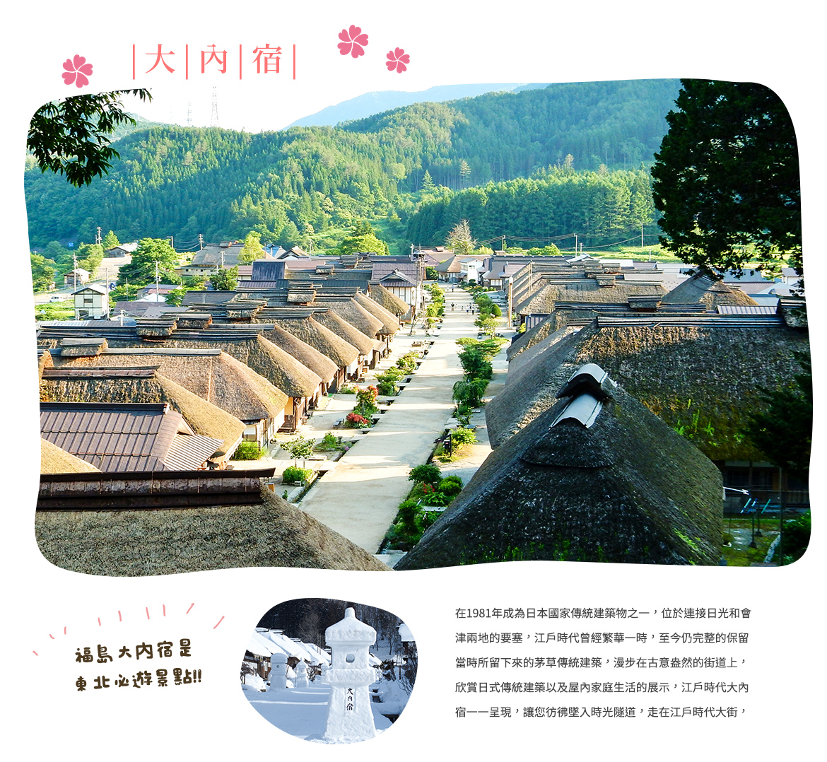 於1981年成為日本國家傳統建造物群保存區域,是日本江戶時代的宿場町(現在所稱的旅館),早期來往東京的商人、官賈或是旅人都會在此地休憩住宿。會津西街道以兩旁茅草屋建築為中心,在當時(江戶時期),運送生活物資時,由北至南都須經由這條道路,是昔日連結會津若松市與日光市的重要街道,也是當時經濟繁榮的交通重鎮,也是江戶時代曾經繁華一時的街道。目前的茅草屋,現今還保存著40多間,雖然這些以前是民房的茅屋,現在大部份都改建為民宿、食堂、藝品店了,但依然還保留著當時的茅草式建築。無論是古意盎然的街道、日式傳統建築以及屋內家庭生活的展示,都將江戶時代大內宿完整的呈現在您眼前,讓您彷彿墜入時光隧道,如同走在江戶時代裡,體驗著純日式風情。