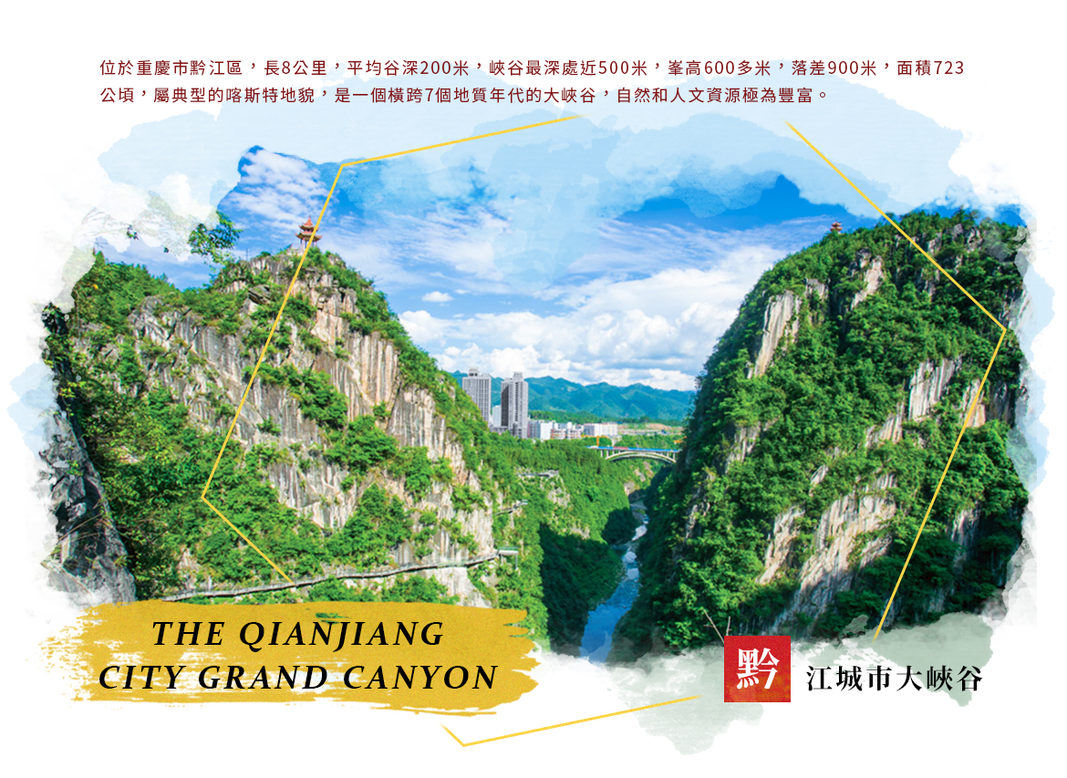 中國唯一的城市大峽谷,世界罕見的礫岩溶洞群,形成了「城在峽谷上,峽谷城中央」的全球罕見、亞洲唯一的獨特城市景觀。峽谷兩岸山峰海拔最高1,100 多米,屬喀斯特地貌,橫跨7個地質年代。登高遠望,恰似一條綠色絲帶,將老城 新城縫合在一起,繪就一幅名副其實的「城即景、景即城」的水墨丹青。谷寬80-100米,平均深度200米,最大落差500米;峽谷峭壁直立,崖壁大多與地平線成直角。當你走上808米長的空中棧道,尤其是懸掛在500米高空的透明玻璃棧道上,其刺激的感受只有親臨現場才能體會。
