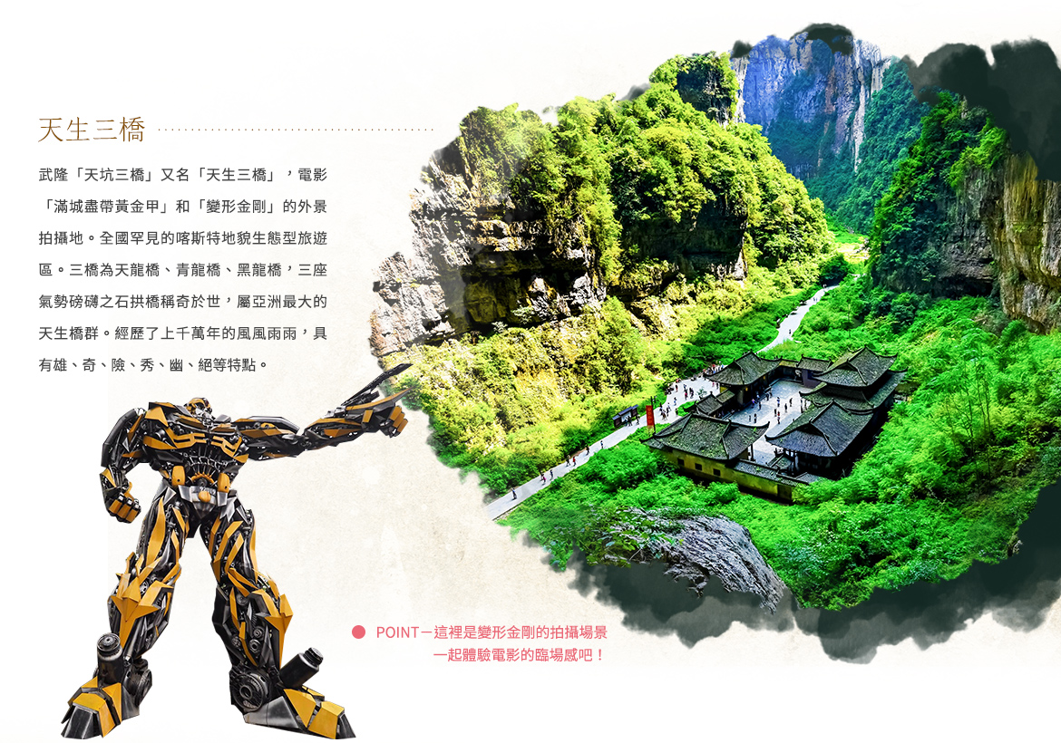 武隆「天坑三橋」又名「天生三橋」,電影「滿城盡帶黃金甲」的外景拍攝地。全國罕見的喀斯特地貌生態型旅遊區。三橋為「天龍橋、青龍橋、黑龍橋」,三座氣勢磅礴之石拱橋稱奇於世,屬亞洲最大的天生橋群。兩坑為「天龍天坑、神鷹天坑」。大自然造就了三座天生石拱橋,經歷了上千萬年的風風雨雨,具有雄、奇、險、秀、幽、絕等特點。